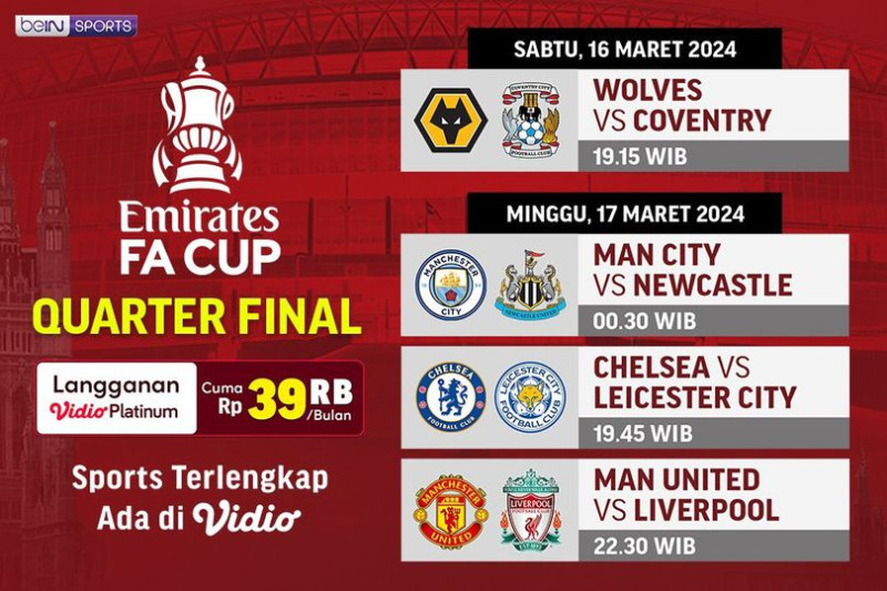 CHANELRAKYAT | Jadwal lanjutan pertandingan Piala FA 2023/2024 babak perempat final yang bakal berlangsung pada, 16 dan 17 Maret 2024 mendatang. Seluruh laganya disiarkan langsung eksklusif melalui layanan OTT Vidio.