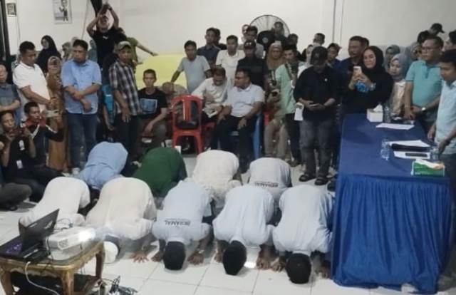 Usai konferensi Pers, bersama tim pemenangan pasangan calon Bupati dan Wakil Bupati Kolaka nomor urut 1, Haji Amri Jamaluddin dan Husmaluddin melakukan sujud bersyulur atas kemenangan yang diraih pada Pilkada Kolaka 2024. [ms/cr]